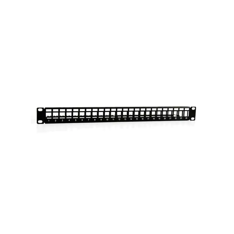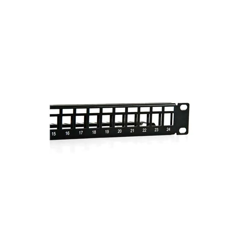Patch panel 24 conectores de la marca 2LAN Equipment para ancho de perfil estándar de 19" vacío, para inserción de conectores tipo Keystone 180º y con bandeja trasera para enrutado de los cables.