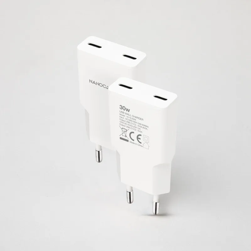 Cargador de Móvil Nanocable 10.10.2029 con tecnología Power Delivery, potencia de salida 30 W y dos puertos USB-C para carga rápida simultánea