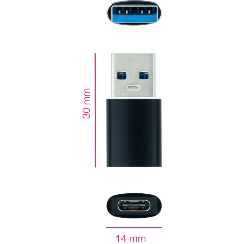 Este adaptador está orientado a la dirección USB-A macho a USB-C hembra, que es la habitual cuando quieres conectar un cable USB-C a un puerto USB-A. El formato compacto de 30 mm ayuda cuando lo usas en hubs o puertos laterales.