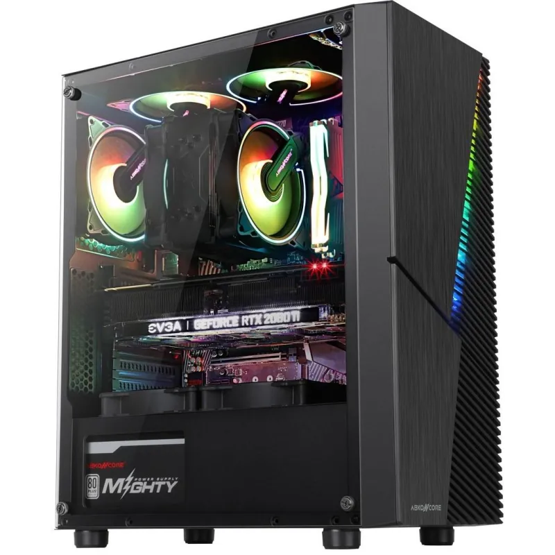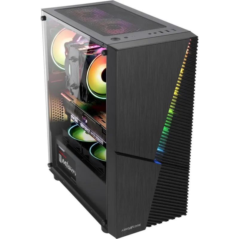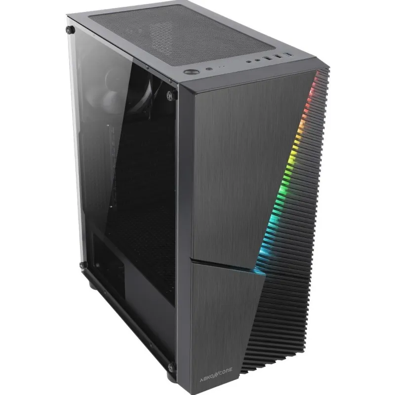 Es compatible con watercooling de hasta 240 mm y dispone de 5 ranuras adicionales para ventiladores. La carcasa Abkoncore muestra su potente configuración, adornada con un hermoso panel lateral de vidrio templado para que pueda admirar sus componentes.
