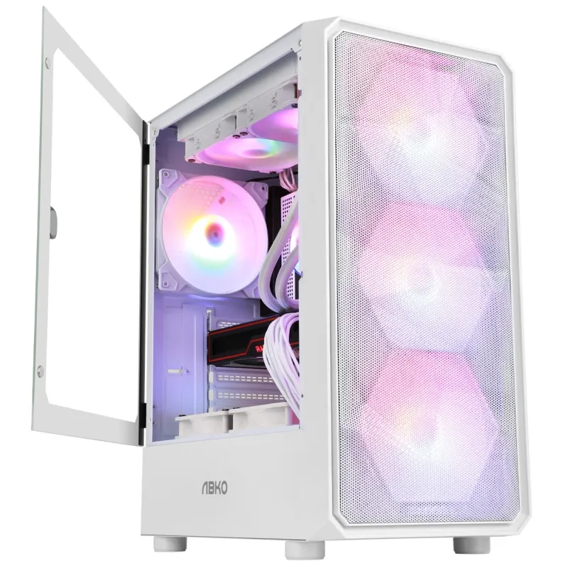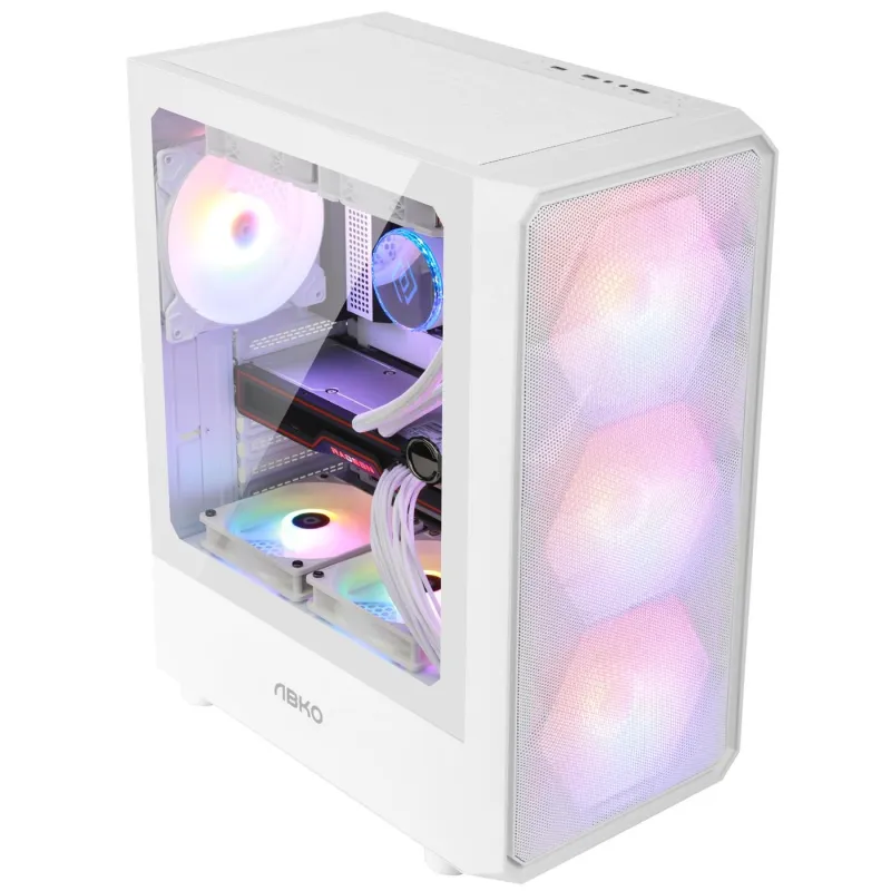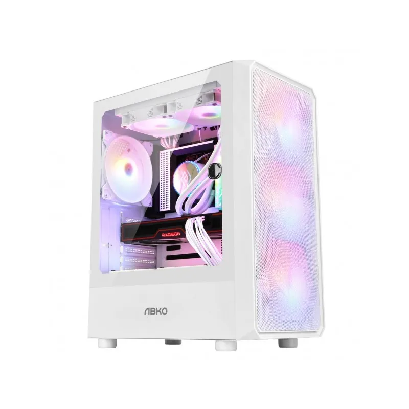Es compatible con watercooling de hasta 240 mm y dispone de 5 ranuras adicionales para ventiladores. La carcasa Abkoncore muestra su potente configuración, adornada con un hermoso panel lateral de vidrio templado para que pueda admirar sus componentes.