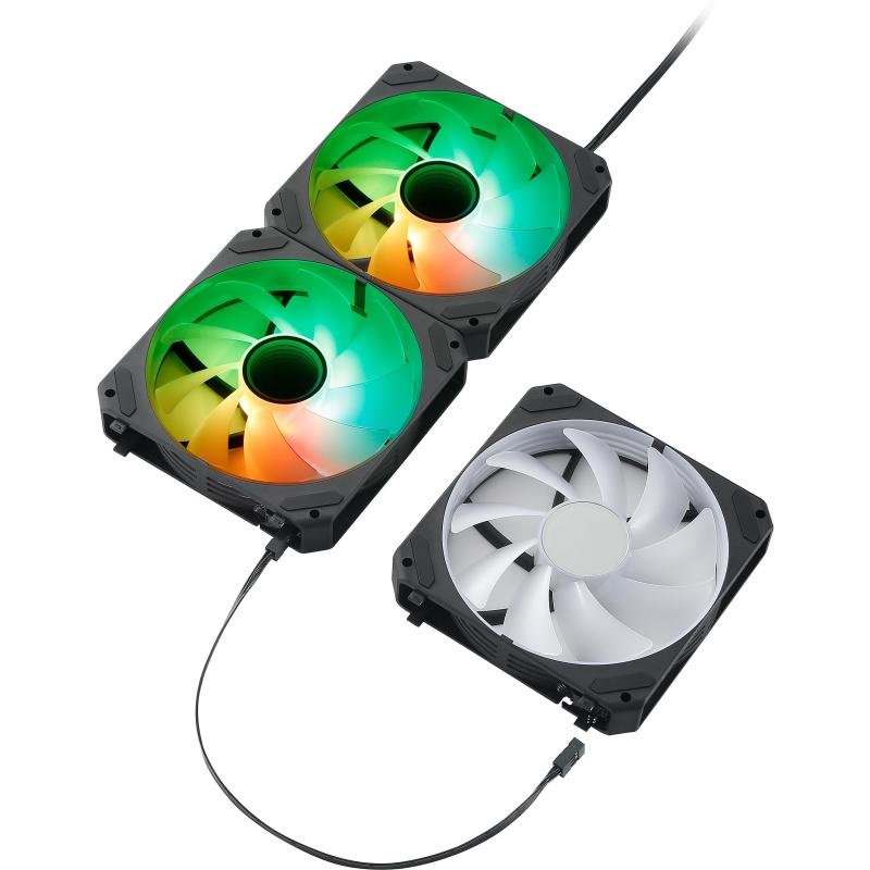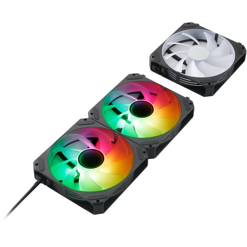 Estos ventiladores cuentan con rodamientos hidráulicos que aseguran durabilidad y estabilidad, con un tiempo medio de fallo (MTTF) de 30000 horas. El diseño en color negro incluye 9 aspas y iluminación LED multicolor, añadiendo un toque estético a cualquier configuración de PC. La iluminación LED se conecta mediante un conector de 3 pines, mientras que los ventiladores utilizan un conector de 4 pines.