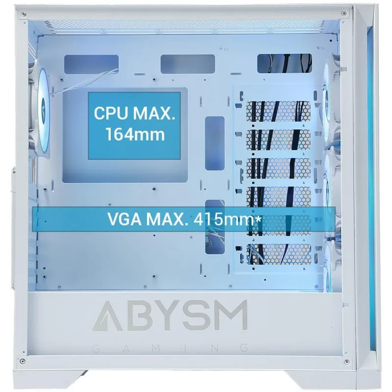 INTERIOR ESPACIOSO: La caja gaming DANUBE MURA BX300 White de Abysm Gaming es la elección perfecta para el que busca una caja compatible con placas madre E-ATX / ATX / Micro ATX / ITX y tarjetas gráficas de hasta 415 mm. Además, esta caja cuenta con una altura de enfriamiento para la CPU de 164 mm para mantener el sistema funcionando a temperaturas óptimas.