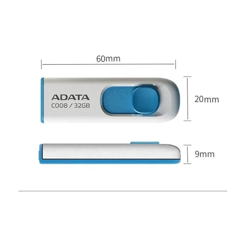 DIMENSIONES QUE ENAMORAN: Pendrive Adata C008 32GB Con un ancho de 19,5 mm, una profundidad de 59,6 mm y una altura de 5,9 mm, su diseño delgado y ligero es perfecto para llevarlo contigo a cualquier lugar. Este dispositivo redefine la portabilidad, asegurando siempre que el usuario pueda llevar consigo su mundo digital de manera cómoda y discreta.