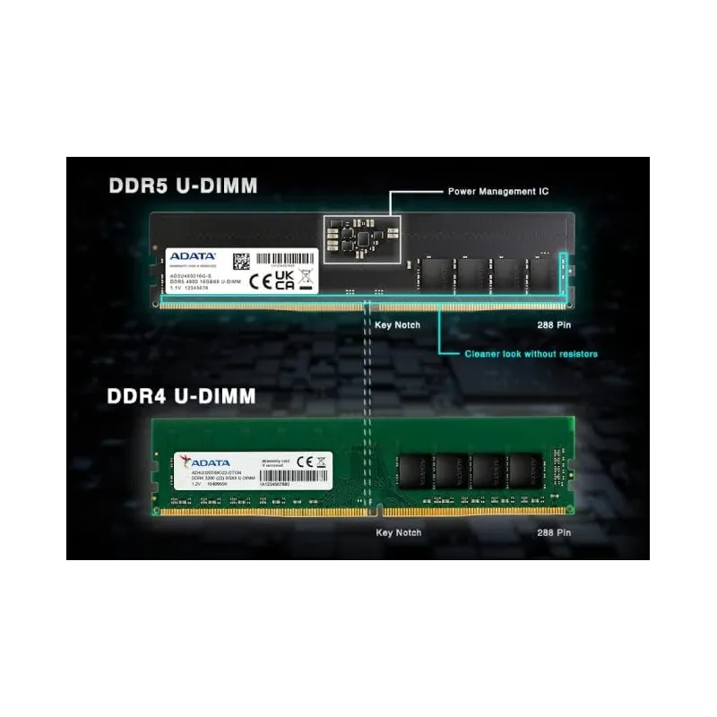 CONSEJOS RÁPIDOS: DDR5 VS DDR4 - ASPECTO: Los módulos DDR5 U-DIMM tienen las mismas dimensiones y número de clavijas que los módulos DDR4. La diferencia más obvia es la posición de la muesca a toda prueba. Además, DDR5 integra resistores de E/S con resistores CMD/ADD. Además, la apariencia de los módulos DDR5 es más limpia que la de DDR4. Además, puede ver un PMIC en el centro.