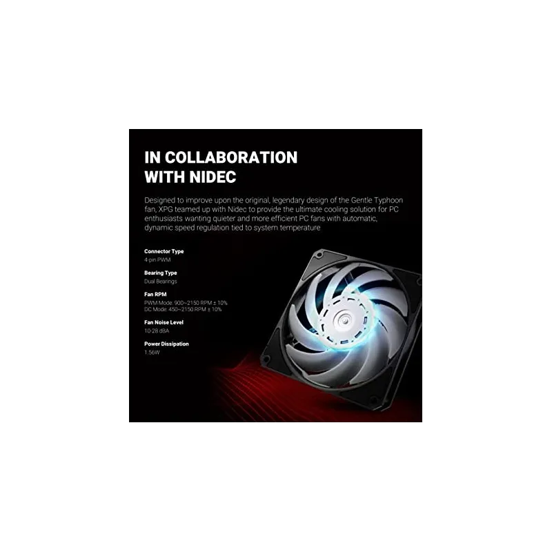 VENTILADOR DE ALTO RENDIMIENTO: XPG se ha asociado con Nidec, mejorando el diseño original de Gentle Typhoon para proporcionar una solución a medida para modders y PC entusiastas de los juegos que solo quieren lo mejor.