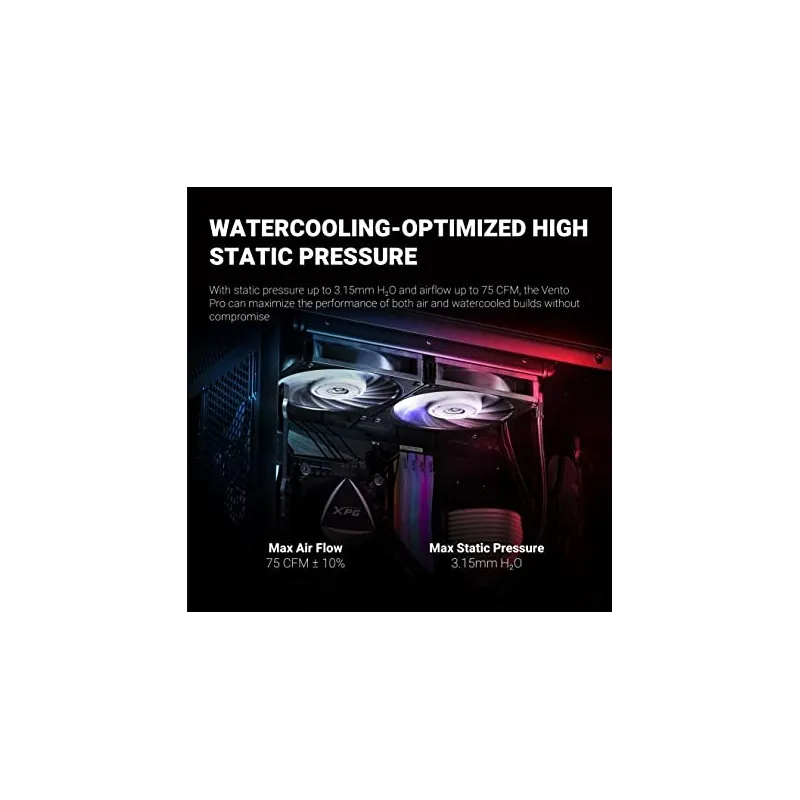 ALTA PRESIÓN ESTÁTICA XPG VENTO PRO 120 PWM tiene alta estática presión de hasta 3,15 mm H?O, sí capaz de producir un flujo de aire de hasta 75 CFM, lo que lo convierte en un equipo ideal de admisión/escape de aire para complementan los radiadores de refrigeración por agua, o para instalarse en la parte delantera a pesar del panel frontal y filtro de polvo que limita el flujo de aire.