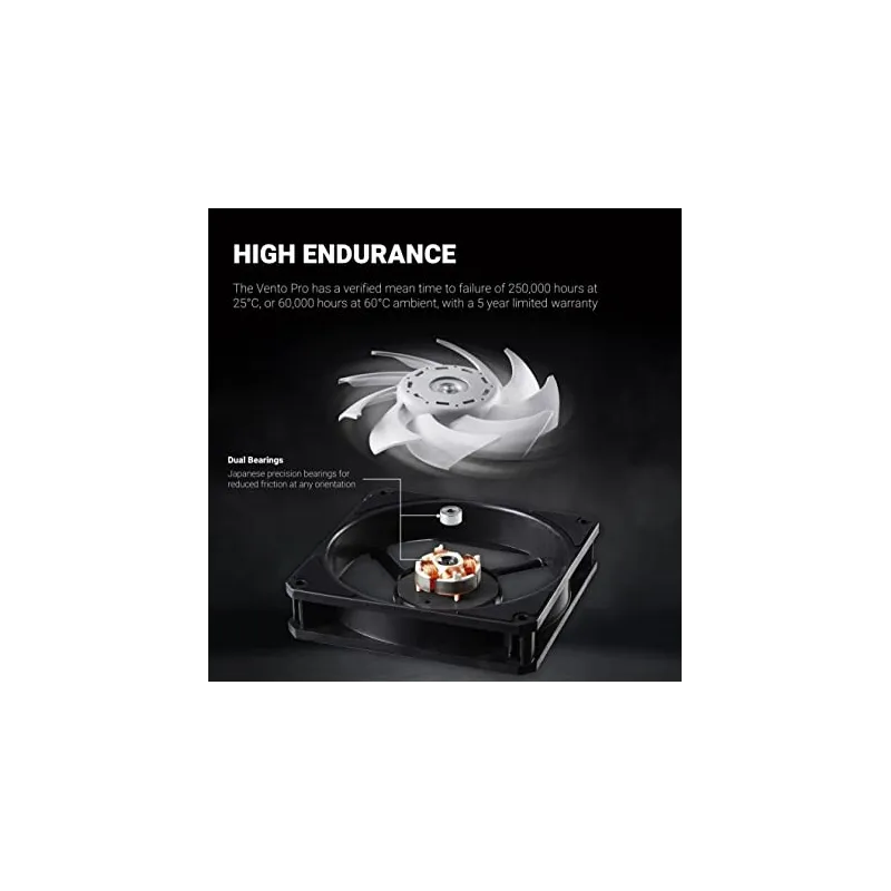 ALTA RESISTENCIA TÉRMICA: El ventilador XPG VENTO PRO 120 PWM tiene un MTTF verificado (tiempo medio hasta el fallo) 250.000 horas a 25 ?, o 60 000 horas a 60 ? ambiente, lo que lo hace ideal para mas pesado cargas de trabajo, pág. más espacio limitado se construye con temperaturas internas más altas.