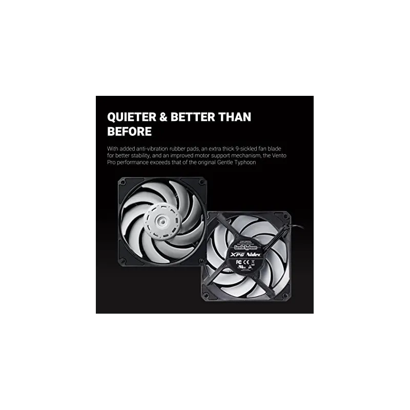 Rodamientos dobles, XPG VENTO PRO 120 PWM El ventilador puede soportar cargas pesadas y soportar el ambiente térmico más alto. Los rodamientos dobles también funcionan con mayor eficiencia, otorgando un giro silencioso y más tiempo esperanza de vida.