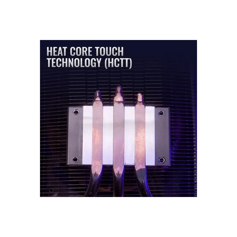 Solución de enfriamiento de aire PWM con un elegante anillo LED RGB alrededor del ventilador del enfriador. Alimentado por la tecnología Heat Core Touch (HCTT) con 3 tubos de calor térmico ultraeficientes. El diseño de enfriamiento de arriba hacia abajo permite una disipación de calor más eficiente. El revestimiento negro en las aletas aumenta el área de disipación de calor y mejora la eficiencia de enfriamiento. Compatible con placas base o concentradores RGB direccionables (H66F).