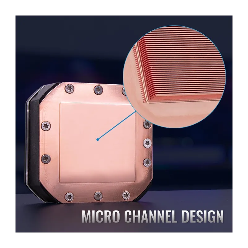 BLOQUE DE AGUA DISEÑO MICRO CANAL: El bloque de agua está construido con cobre puro para una conductividad térmica superior. El diseño de microcanal del bloque permite una disipación de calor más rápida, manteniendo su CPU a la temperatura ideal en escenarios de rendimiento estándar y de overclocking.
