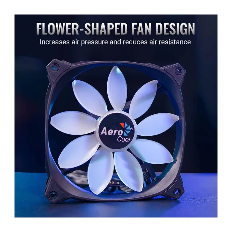 DISEÑO DE ABANICO EN FORMA DE FLOR: El diseño exclusivo del ventilador en forma de flor aumenta la presión del aire y reduce la resistencia del aire para lograr un rendimiento de enfriamiento superior.