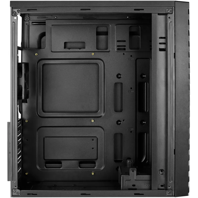 El chasis de PC en formato Midi Tower está fabricado con materiales de alta calidad como Acrilonitrilo butadieno estireno (ABS) y SPCC, lo que garantiza durabilidad y resistencia. Diseñado en un elegante color negro, es compatible con tarjetas madre ATX, micro ATX y Mini-ITX. Ofrece una excelente capacidad de almacenamiento con 3 bahías de 3.5" y 4 bahías de 2.5", además de 6 ranuras de expansión.