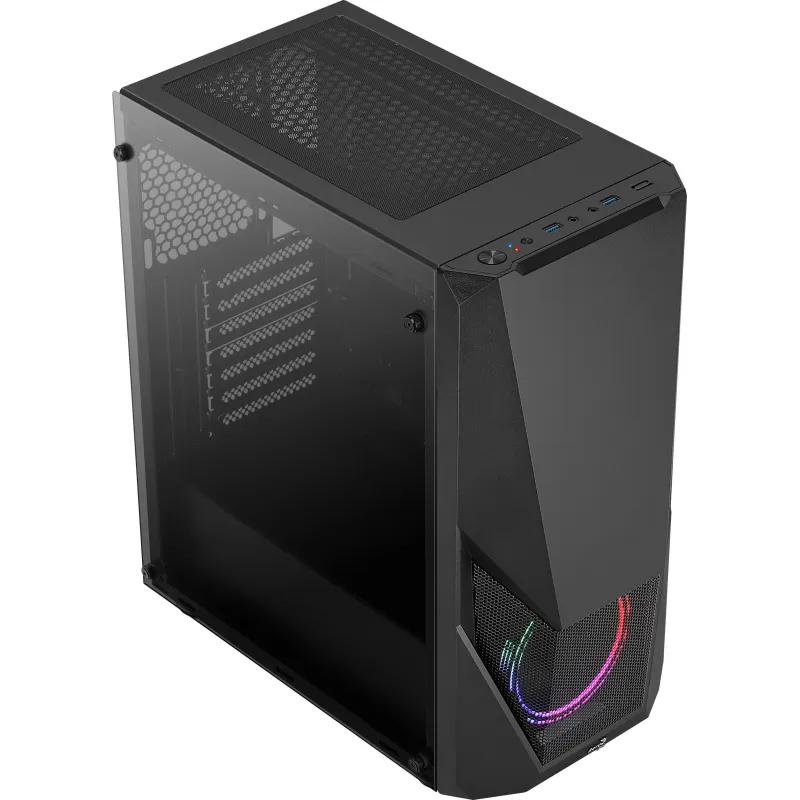 SEMITORRE DE ALTO RENDIMIENTO: Semitorre de alto rendimiento con panel frontal de corte futurista para potenciar la estética de tu setup. Panel frontal con diseño de rejilla para una mayor ventilación y una mejor visualización del ventilador LED frontal. Equipada con un ventilador de 12cm Fixed RGB (Saturn 12 FRGB) en el frontal de la caja. Panel lateral total de cristal templado para mostrar el interior de tu rig.