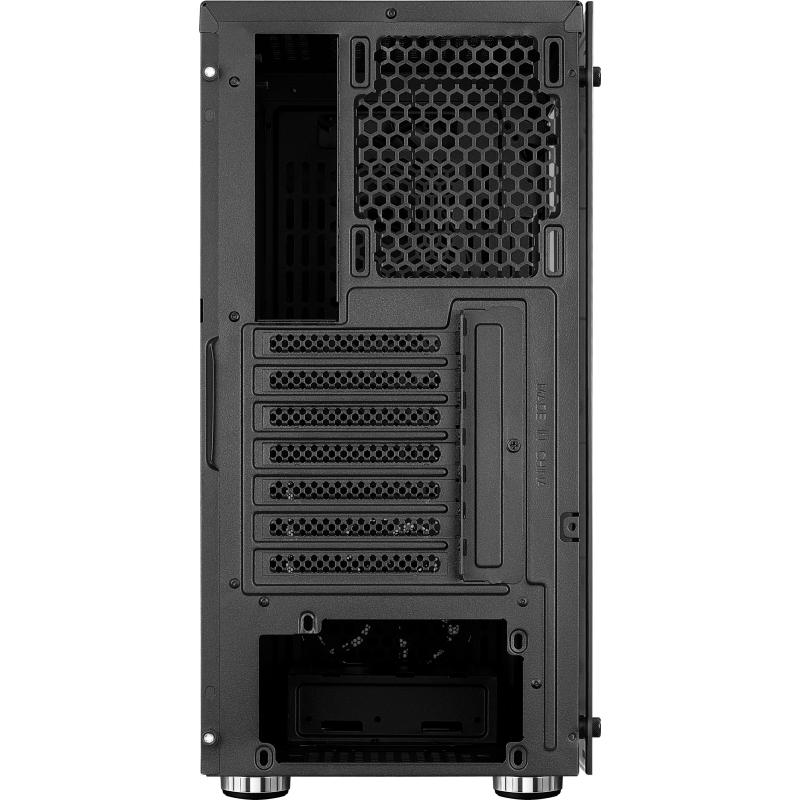 El diseño del gabinete incluye 2 puertos de 3.5" y 4 bahías de 2.5", así como 7 ranuras de expansión, permitiendo una amplia capacidad de almacenamiento y expansión. Además, cuenta con una ventana lateral y paneles de vidrio templado que ofrecen una vista clara del interior y un aspecto elegante.