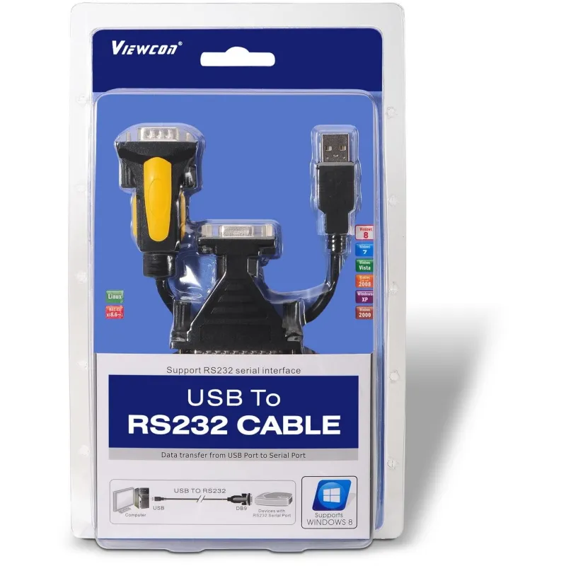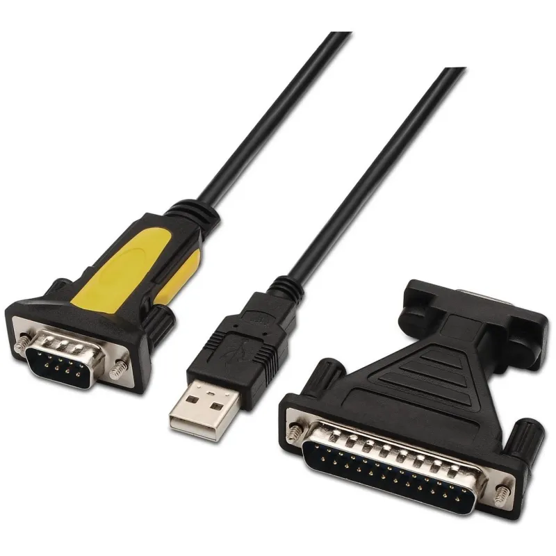 - Conector USB tipo A macho en un extremo y RS232(DB9) macho en el otro