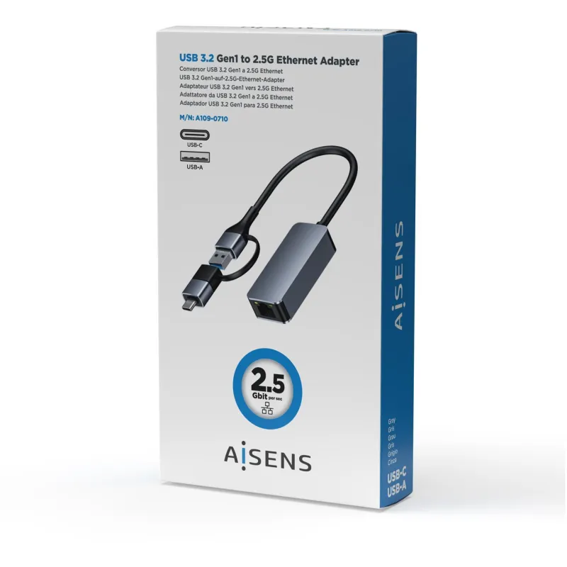 Aisens A109-0710 Conversor USB 3.2 Gen1 USB-A+USB-C a Ethernet 2.5G 10/100/1000/2500 Mbps 15cm Gris
