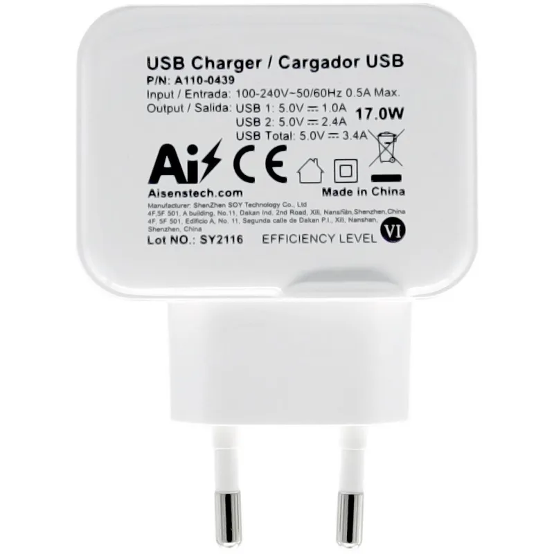 AISENS® – Cargador USB 17W 5V/3.4A, 2xUSB con control AI, Blanco