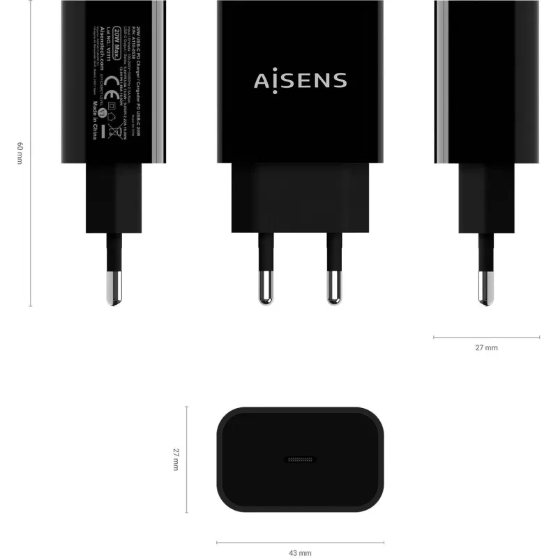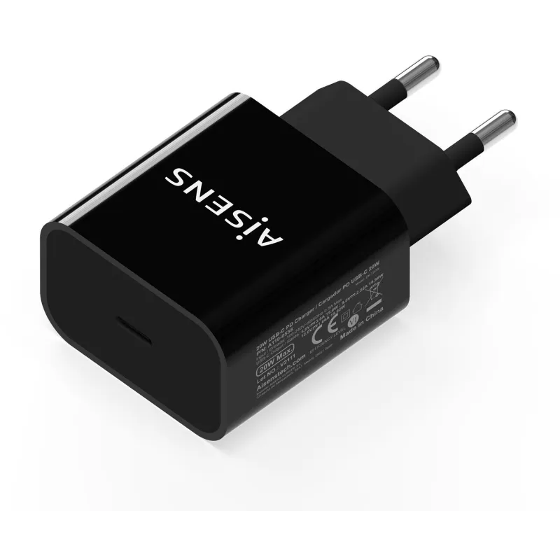 AISENS® – Cargador USB-C PD3.0 1 Puerto 1xUSB-C 20W, Negro.