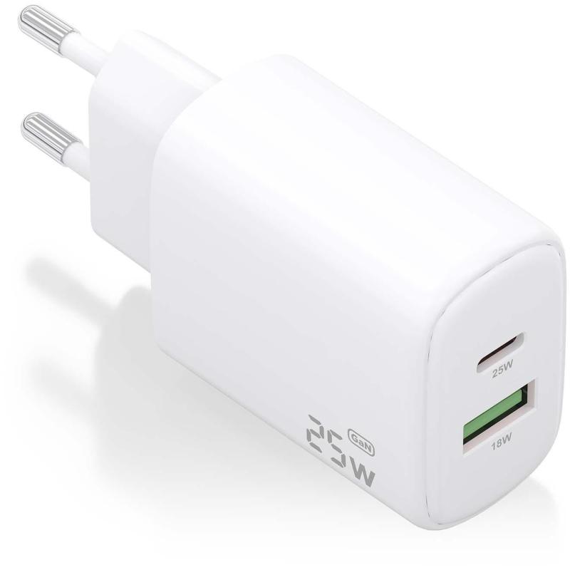 Cargador de Móvil Aisens A110-0911 carga rápida GaN de 25W USB-C y USB-A compatible universal Diseño compacto y seguro con certificación CE y RoHS.