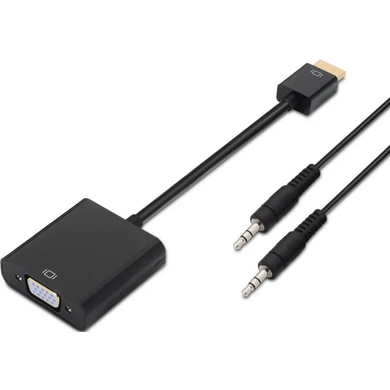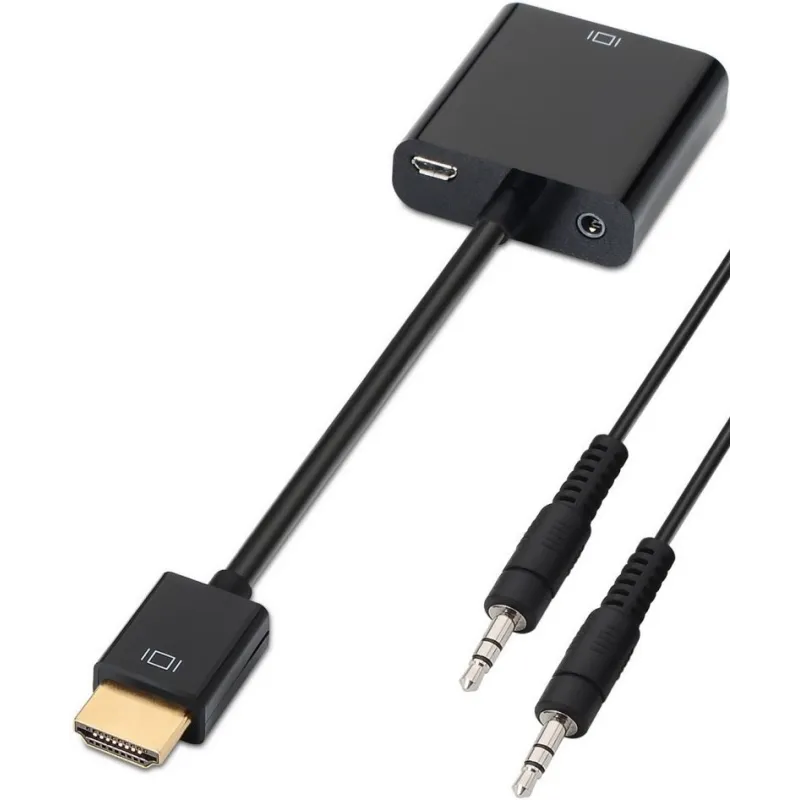 - Conversor HDMI a SVGA y audio con conector HDMI macho en un extremo y conector D-sub HDB15 hembra y Jack 3.5 hembra en el otro.