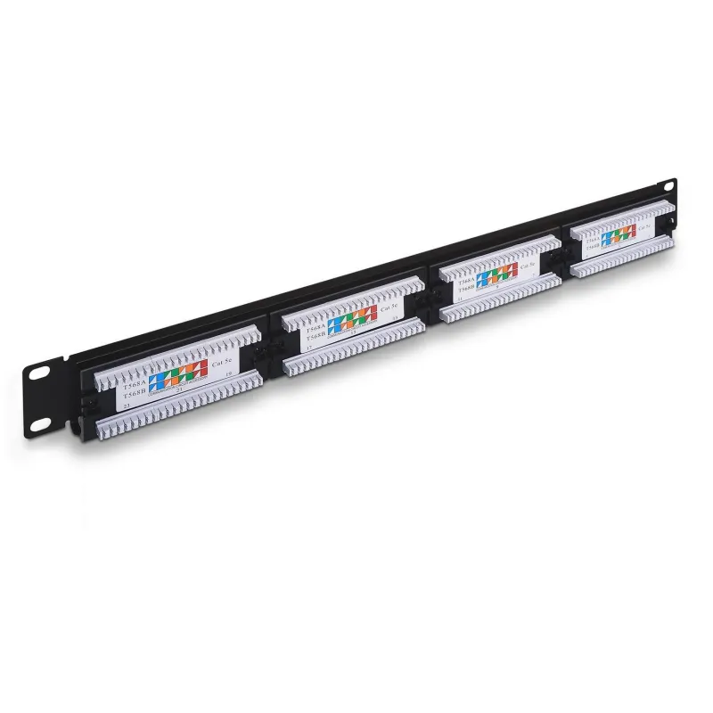 - Panel de parcheo de 24 puertos para conexión RJ45 Cat.5e UTP.
