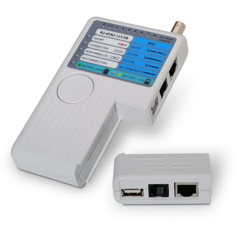Compatible con una amplia gama de conectores, incluyendo BNC, RJ-11, RJ-12, RJ-45, y USB, este comprobador es versátil y adecuado para una variedad de tareas de diagnóstico. A pesar de no contar con pantalla incorporada, su interfaz intuitiva garantiza una experiencia de usuario sin complicaciones.