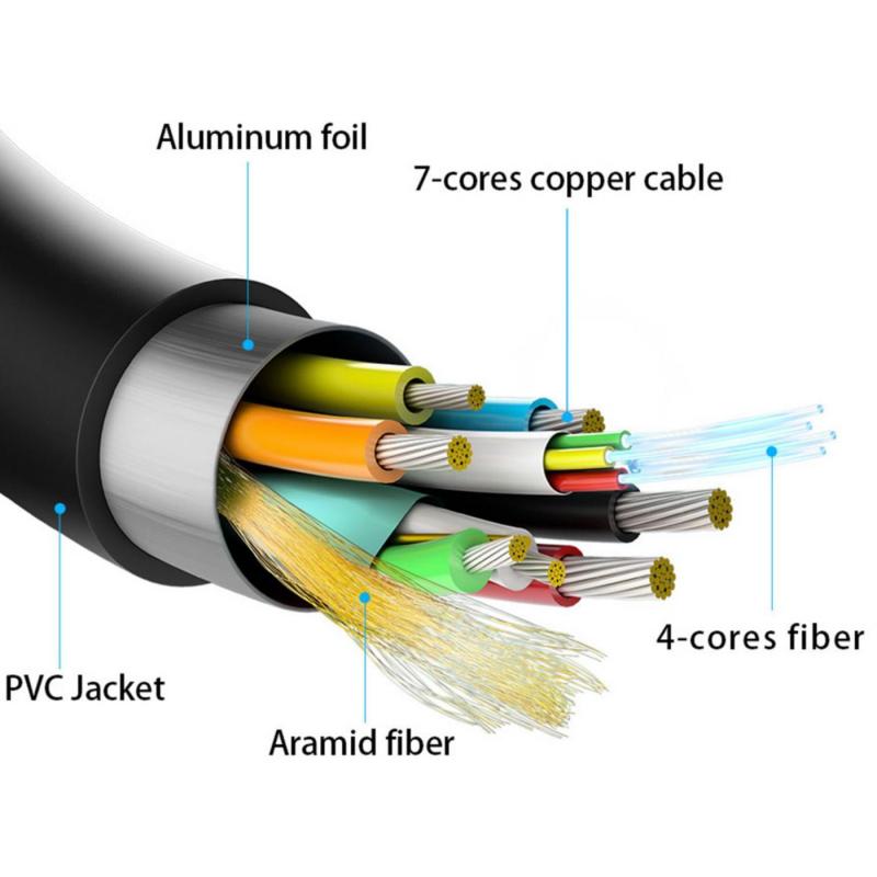 VERSATILIDAD Y DURABILIDAD: Diseñado con materiales de alta calidad, este cable combina fibra óptica y cobre para ofrecer la mejor conductividad y resistencia. Los contactos de los conectores están chapados en oro, lo que minimiza la pérdida de señal y maximiza la durabilidad. Además, el forro de cloruro de polivinilo (PVC) y la placa de aluminio aseguran que el cable pueda soportar un uso intensivo y condiciones ambientales extremas, operando eficientemente en un rango de temperaturas que va desde -40 hasta 70 grados Celsius.