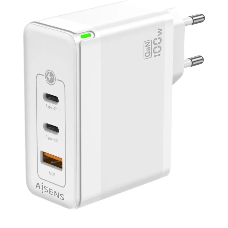 Cargador de Móvil Aisens ASCH-100W3P008-W con tecnología GaN, entrega de energía USB 100 W y carga rápida compatible con USB-C y USB 2.0