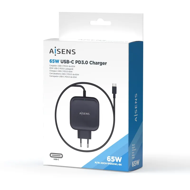 AISENS® – Cargador 65W PD3.0 QC3.0 1XUSB-C 1.2M, Negro.