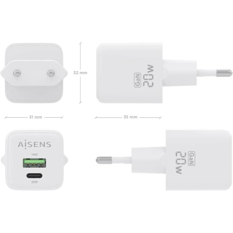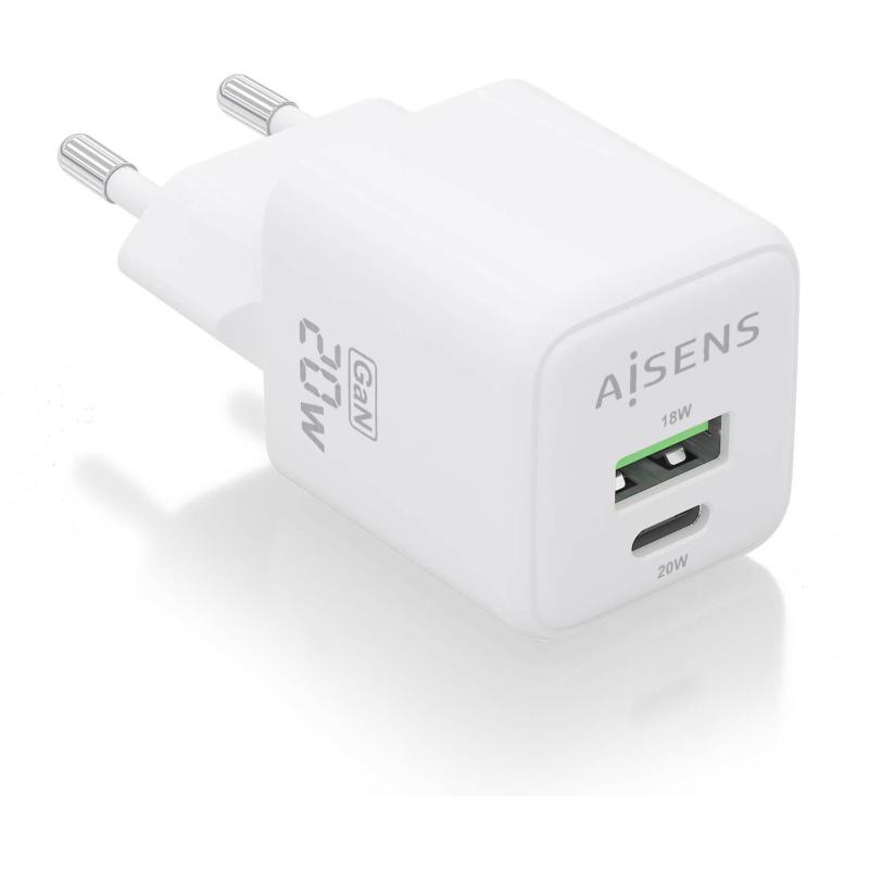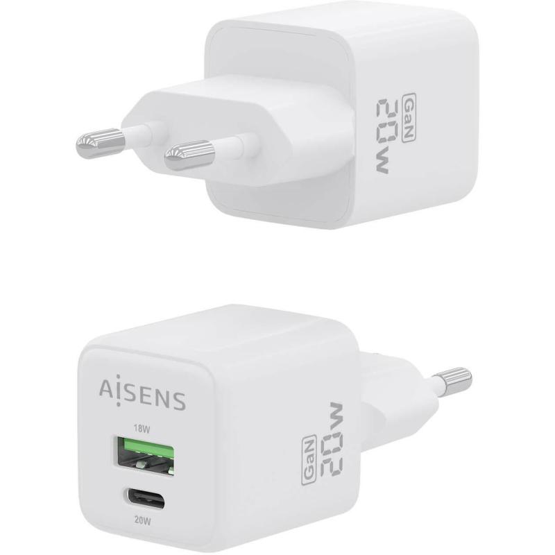 Cargador de Móvil Aisens ASCH-20W2P010-W carga rápida 2 puertos USB y USB-C 20W protección contra sobrecarga y diseño compacto en color blanco