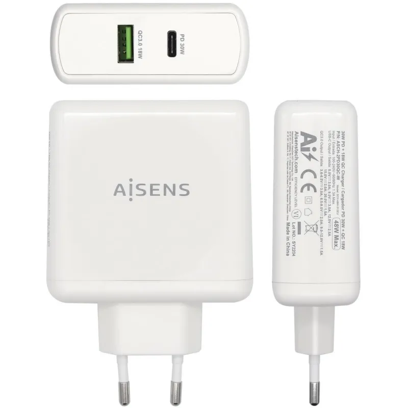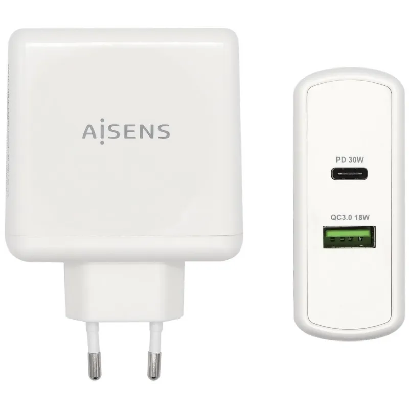 AISENS® – Cargador 48W, 1XUSB-C PD3.0 30W, 1XUSB-A QC3.0 18W, Blanco