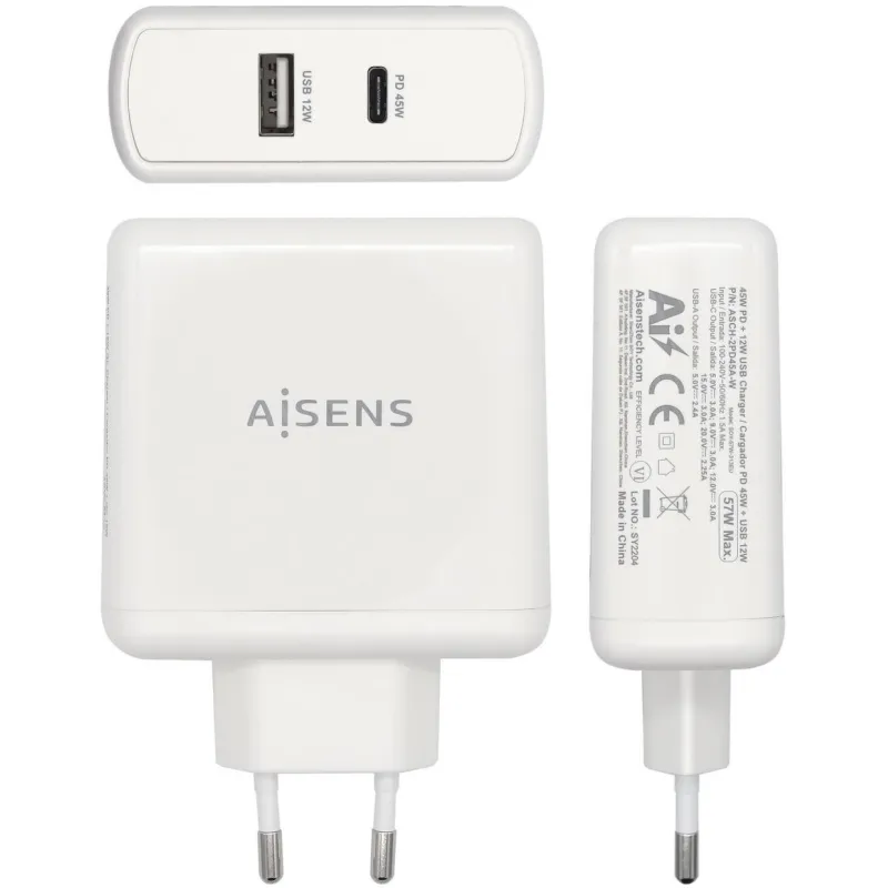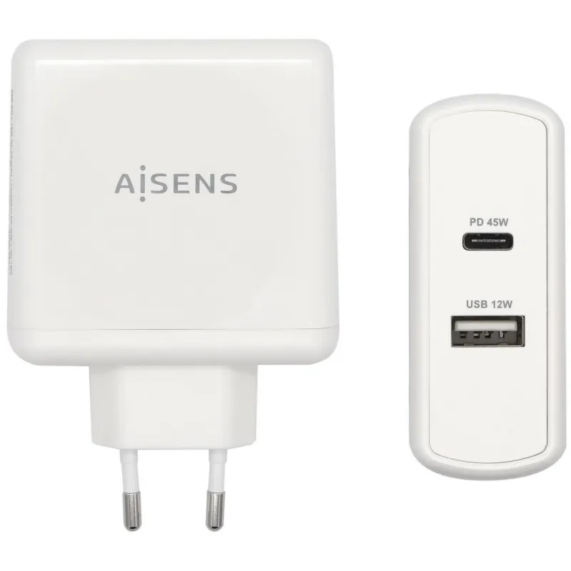 AISENS® – Cargador 57W, 1XUSB-C PD3.0 45W, 1XUSB-A 5V/2.4A 12W, Blanco.