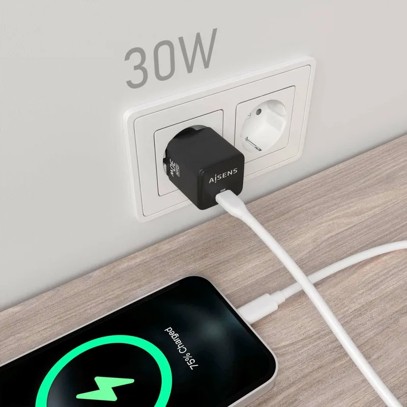 Cargador de Móvil Aisens ASCH-30W1P036-BK con tecnología Power Delivery 3.0, transistores de nitruro de galio y carga rápida universal de 30 W