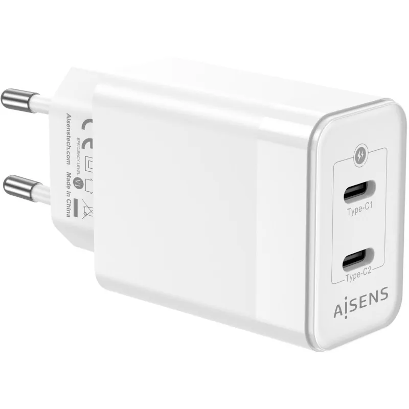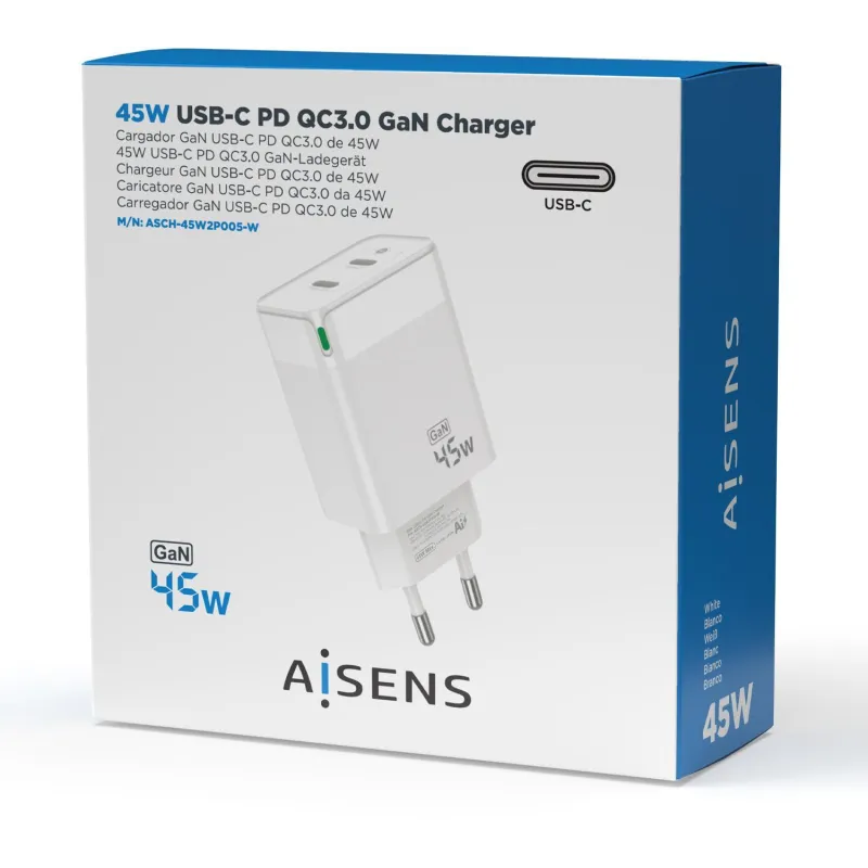 Aisens ASCH-45W2P005-W Cargador GaN de Pared 2xUSB Tipo-C 45W Blanco
