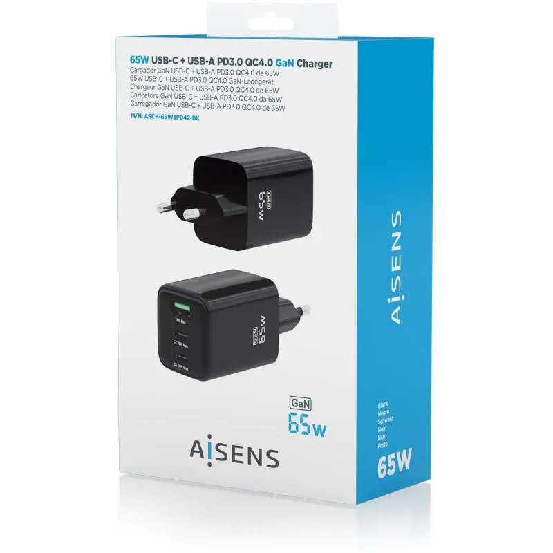 AISENS ASCH-65W3P042-BK Cargador GaN 65W (2x USB-C PD 3.0 + 1x USB-A) Negro