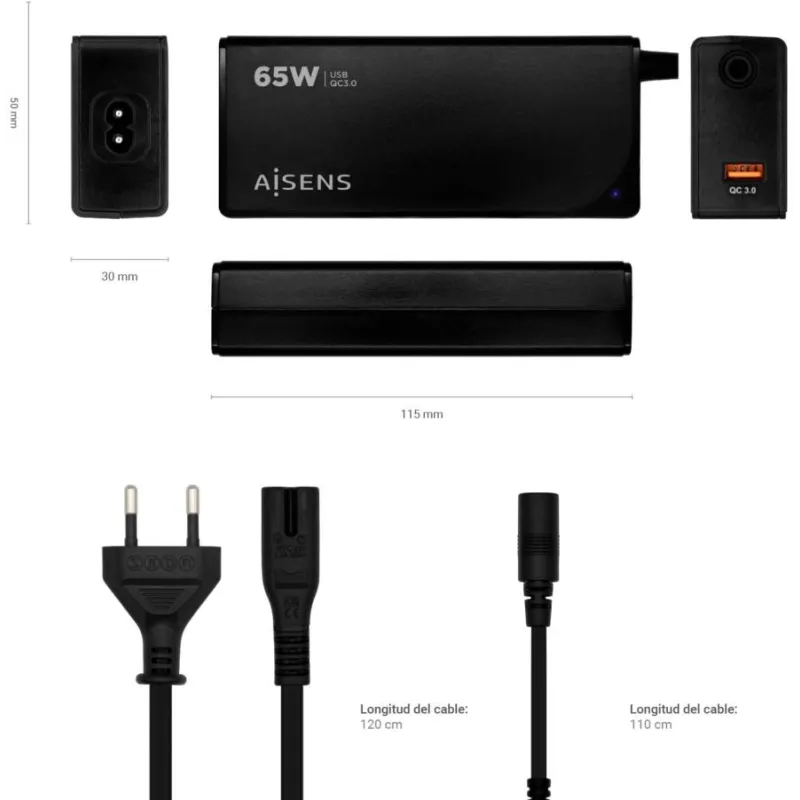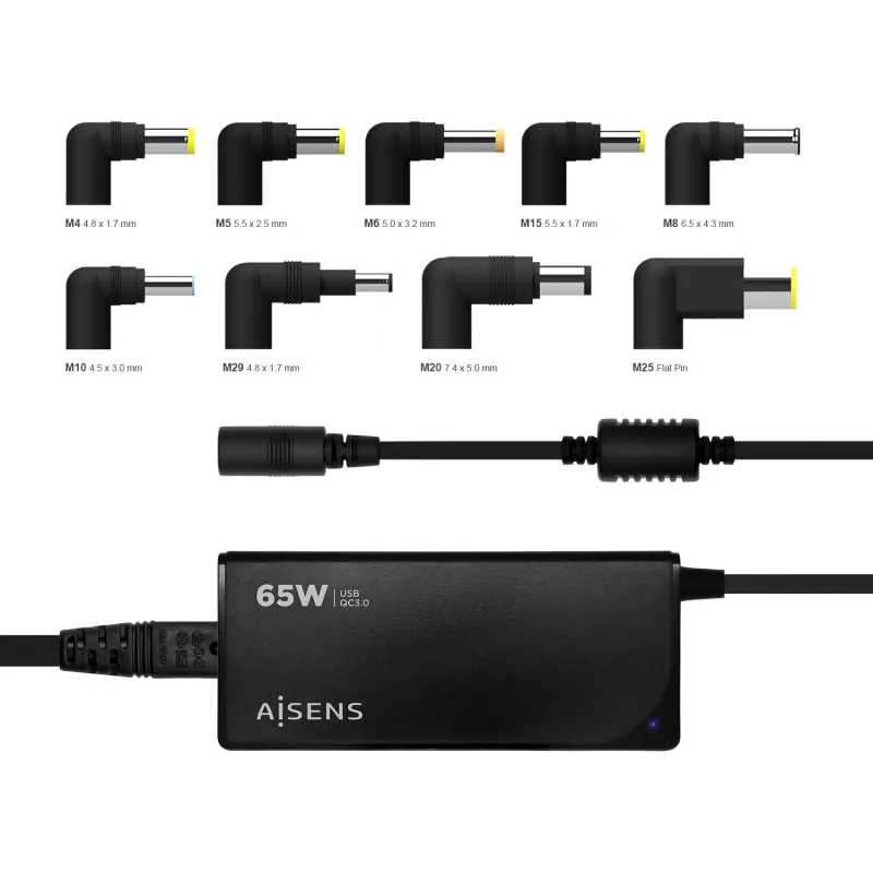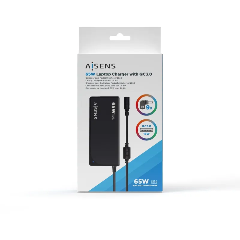 AISENS® – Cargador 65W automático universal con 9 conectores y USB QC3.0 para cargar portátiles, móviles, cámaras y tablets etc. Diseño muy elegante, moderno y práctico.