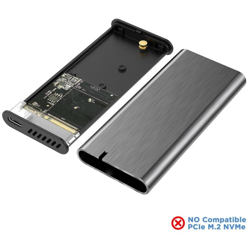 La caja externa para unidad de estado sólido (SSD) es una solución de almacenamiento portátil y eficiente, diseñada para unidades de almacenamiento M.2. Soporta interfaces SATA y es compatible con longitudes de unidades de almacenamiento de 42, 60 y 80 mm, permitiendo una capacidad máxima de almacenamiento de hasta 2 TB. Incluye conexión USB 3.2 Gen 1 con un conector USB Tipo C hembra.