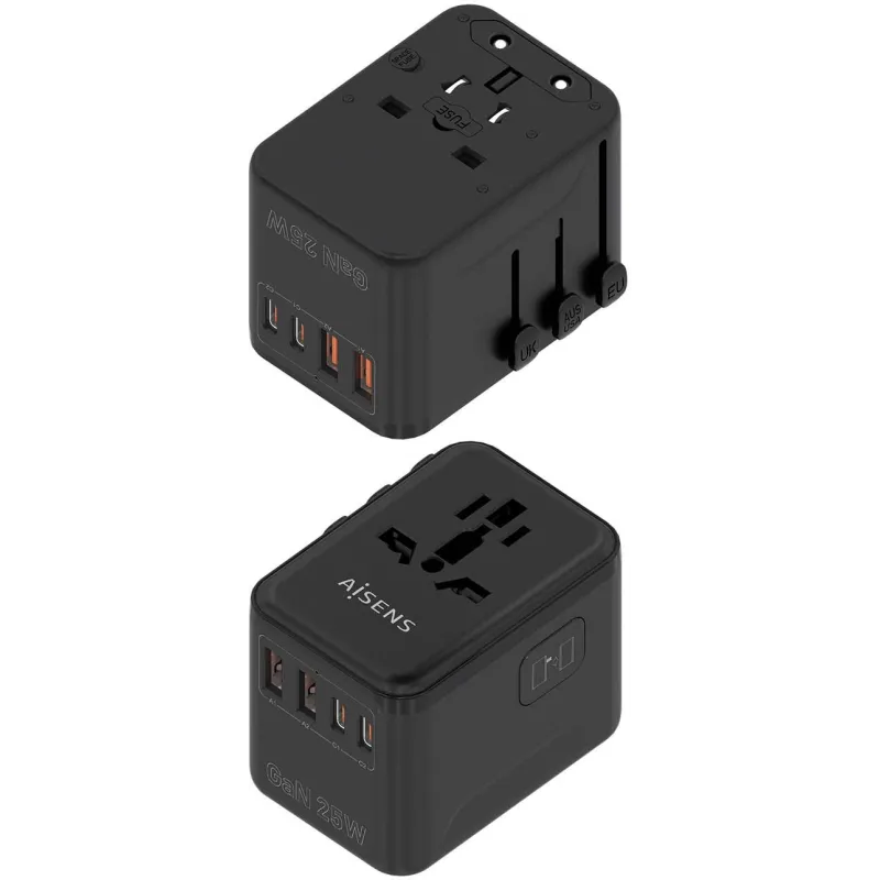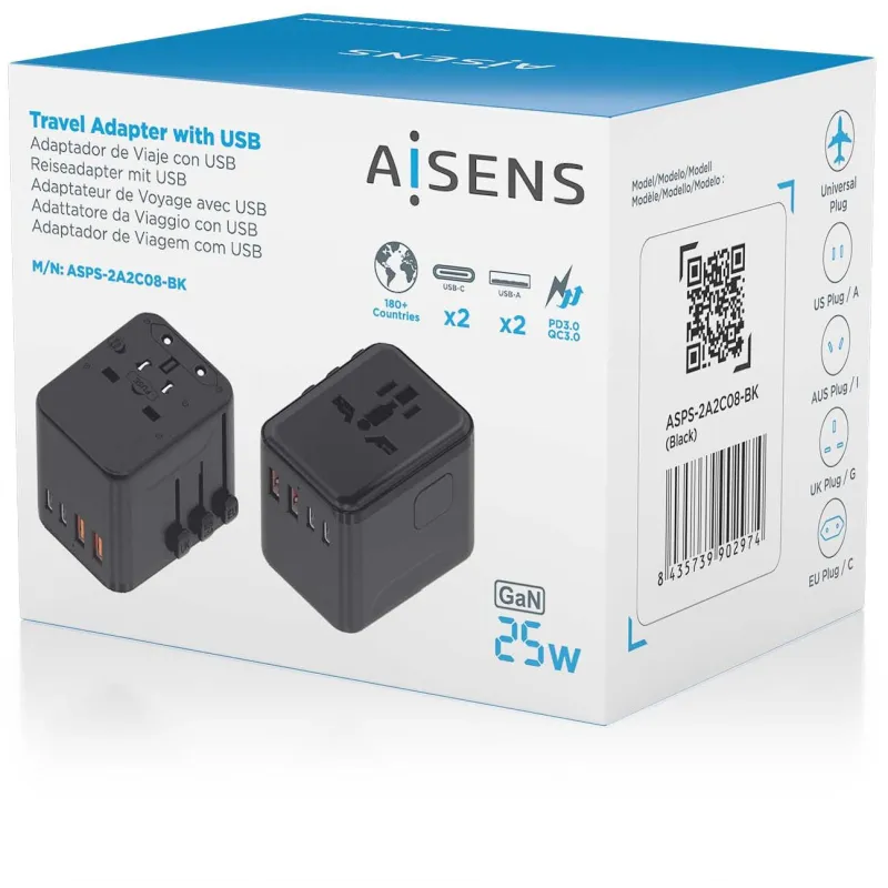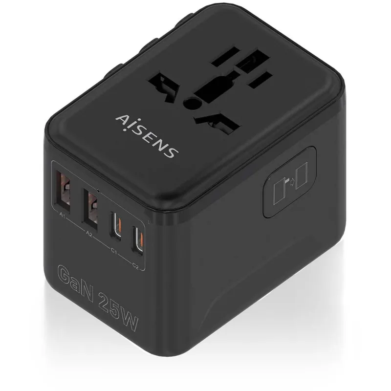 Gracias a su potencia de salida 25 W en los puertos más potentes, el Cargador de Móvil Aisens ASPS-2A2C08-BK ofrece un rendimiento sobresaliente incluso con dispositivos de alta demanda energética. La entrega de energía USB Power Delivery 3.0 permite una carga optimizada para equipos compatibles, reduciendo significativamente los tiempos de espera. Su capacidad para gestionar hasta 3 A de corriente de salida en cada puerto garantiza una distribución equilibrada de la energía. Incluye adaptadores para múltiples regiones (AU, CN, EU, GB, JP, TW, UK, US), lo que lo convierte en el compañero ideal para viajes internacionales. Con un voltaje de entrada de 100 - 250 V, se adapta fácilmente a distintas redes eléctricas. Además, su peso reducido y dimensiones compactas lo hacen fácil de transportar sin sacrificar funcionalidad.