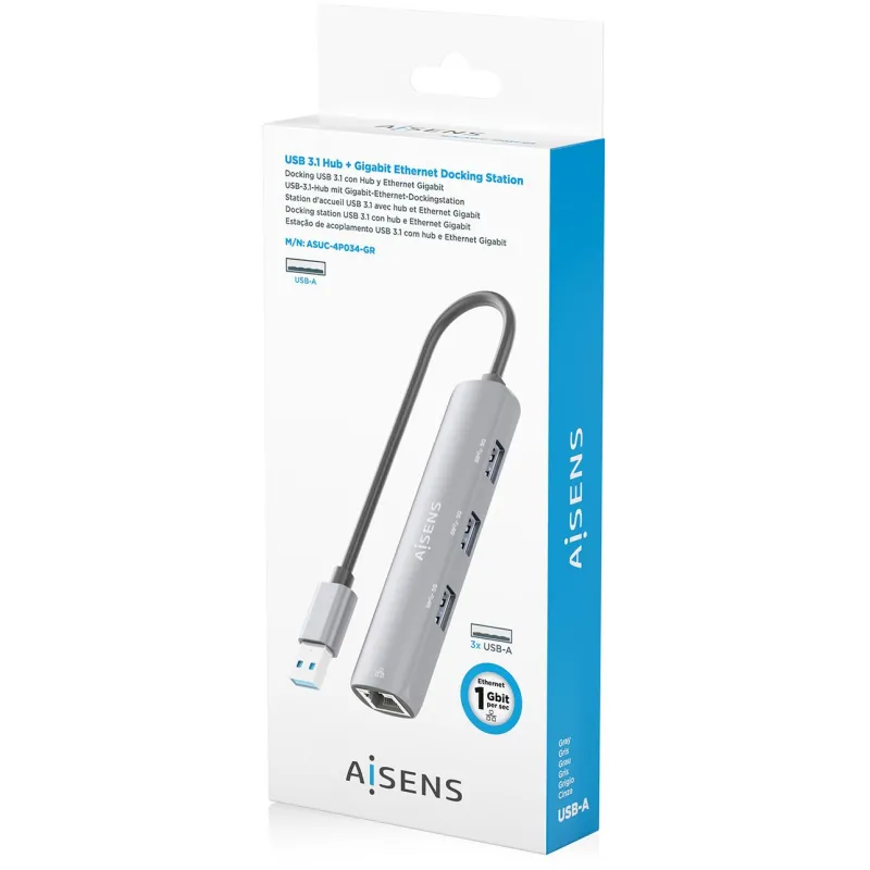 Aisens ASUC-4P034-GR Docking Station USB-A a Ethernet Gigabit + HUB 3x USB-A 15 cm Gris