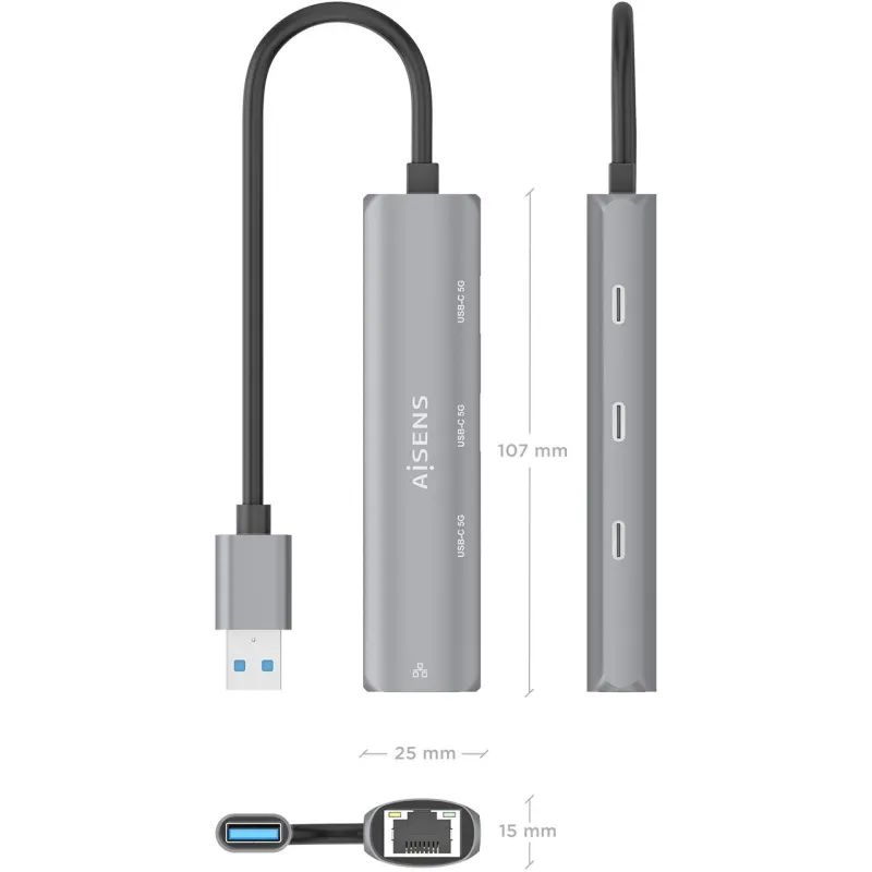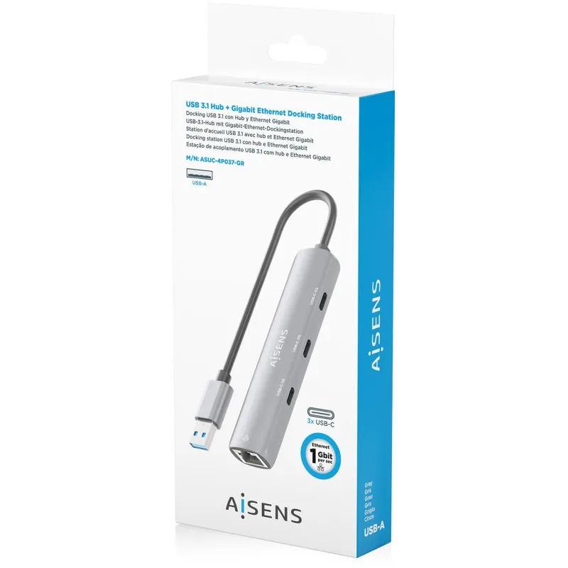 Aisens ASUC-4P037-GR Docking Station USB-A 3.0 a Ethernet Gigabit + HUB 3x USB-C, Gris, 15cm