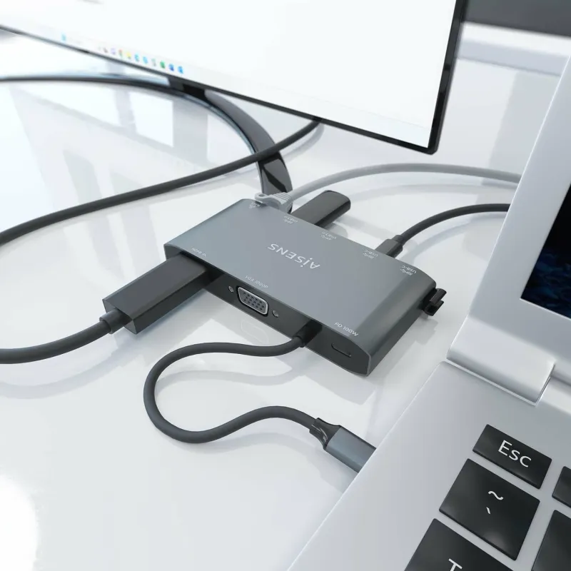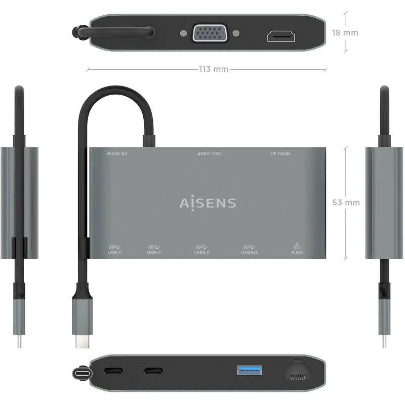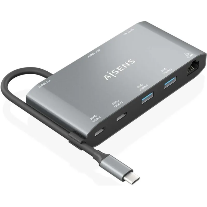 AISENS® – Conversor USB-C a 1xHDMI, 1xVGA, 1xRJ45, 2xUSB-A, 2xUSB-C 5G, 1xUSB-C PD