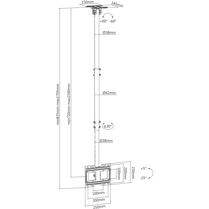 - Angulo de Inclinación: -25º / 5º (*). Angulo de giro: -30º / 30º (*). Distancia entre techo y pantalla: ajustable entre 720 y 1590mm (*). (*) depende de la instalación y del espacio disponible.