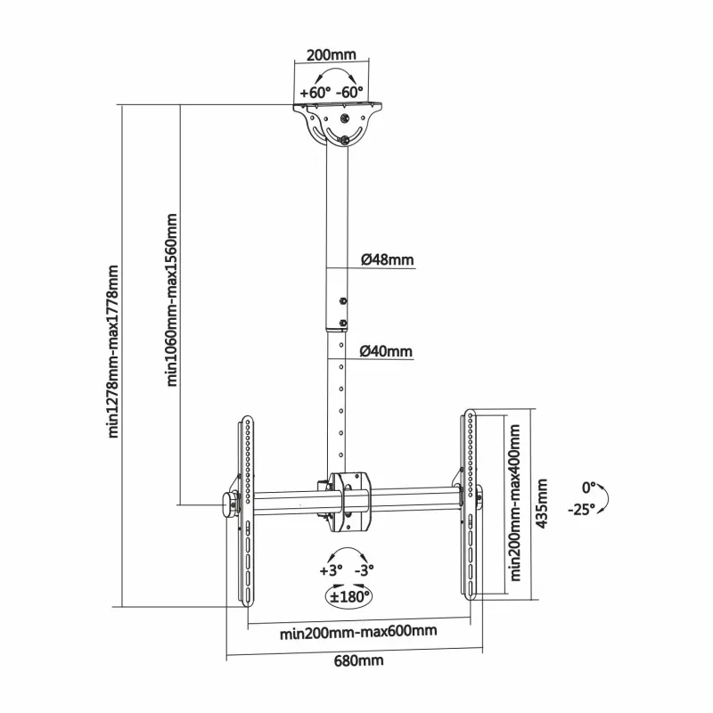 - Ángulo de nivelación: -3º / +3º. Distancia entre techo y pantalla: ajustable entre 1060 y 1560mm. Sistema de pasacables: dispone de unos orificios para poder pasar los cables por el interior del tubo.