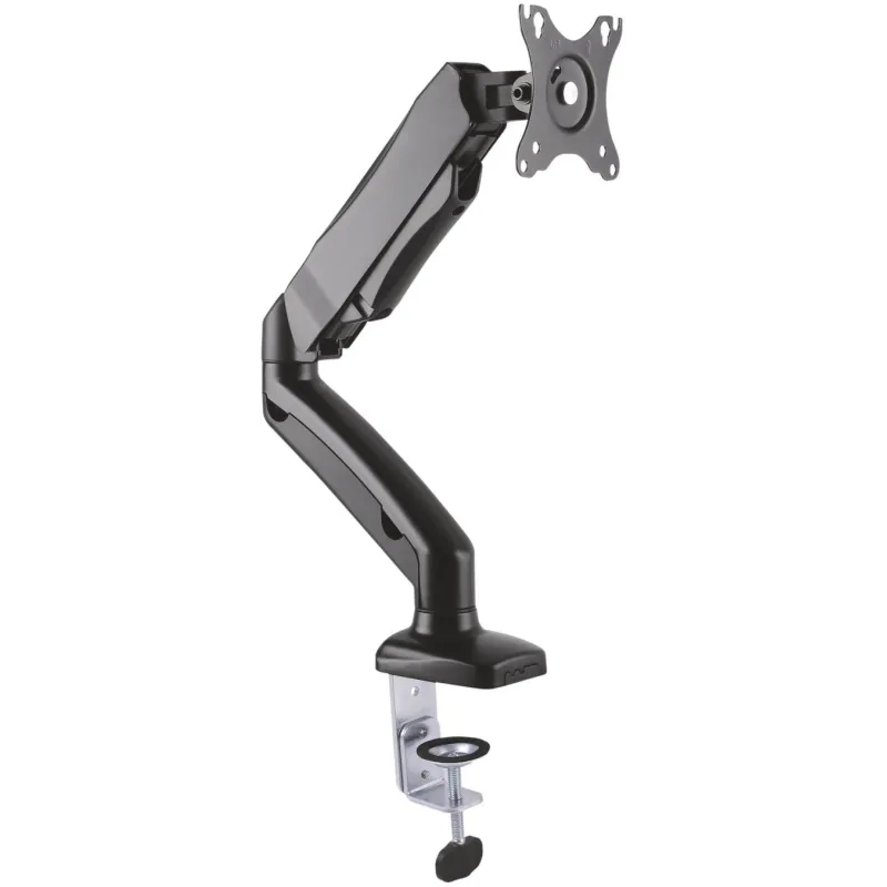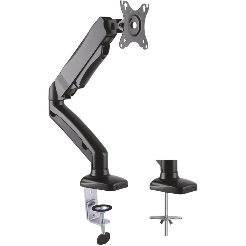 Este soporte de montaje para pantallas es ideal para cualquier entorno de trabajo gracias a su alta compatibilidad y robustez. Soporta un tamaño de pantalla mínimo de 33 cm (13") y un máximo de 81,3 cm (32"), con una capacidad de peso de hasta 9 kg. Su diseño de abrazadera permite un montaje seguro y sencillo en el escritorio, compatible con interfaces de montaje 75 x 75 mm y 100 x 100 mm. La ergonomía es clave en este producto, ofreciendo ajustes de altura, un ángulo de inclinación de -45 a 90°, y una rotación completa de 360°, permitiendo una personalización total del ángulo de visión con 3 puntos de pivote.