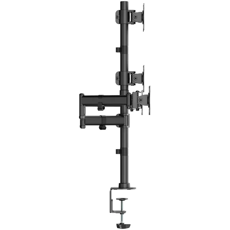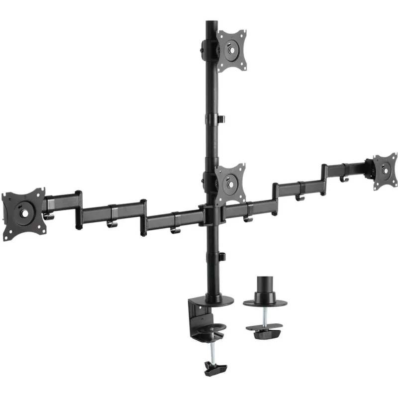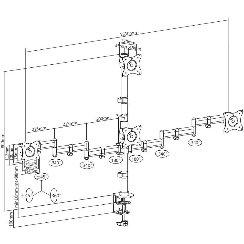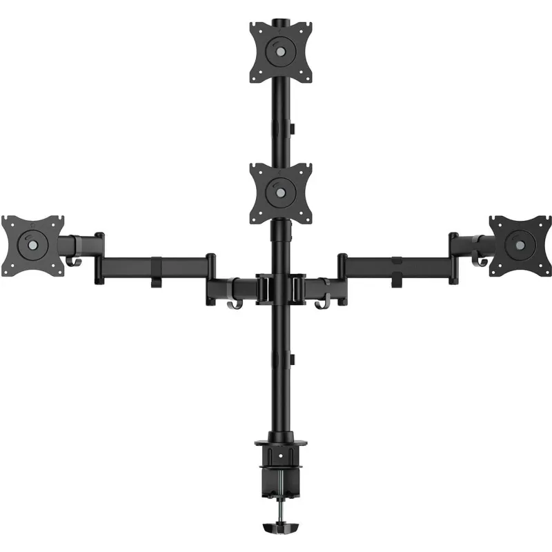 SOPORTE DE MESA ECO GIRATORIO E INCLINABLE PARA 4 MONITORES: Soporte de mesa eco giratorio e inclinable para 4 monitores (4 pivotes, 2 brazos) de 13”-27”. Fabricado con acero de alta resistencia y pintado con pintura electrostática para un acabado perfecto. Se permite la instalación en la mesa a través de la abrazadera o de tornillo pasante. VESA Máximo: 100x100mm (Compatible con VESA de 75x75, 100x100mm). Carga Máxima: 8kg / Brazo. Angulo de Inclinación: -45º / +45º (depende de la instalación y del espacio disponible). Angulo máximo de giro: -45º / +45º (depende de la instalación y del espacio disponible). Ángulo máximo de rotación: 180º (depende de la instalación y del espacio disponible). Sistema de gestión de cables: dispone de unos ganchos para agrupar los cables.