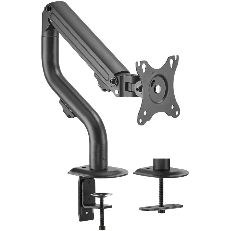 Este soporte de mesa para monitor/TV es la solución ideal para mejorar la ergonomía y organización de tu espacio de trabajo. Compatible con pantallas de entre 43,2 cm (17") y 81,3 cm (32"), soporta un peso máximo de 8 kg, permitiéndote montar una amplia variedad de monitores. Su montaje es versátil gracias a las opciones de abrazadera o atornillado, y es compatible con interfaces de montaje de 75 x 75 mm a 100 x 100 mm. Está diseñado para ser instalado en escritorios con un espesor de 1 cm a 8 cm y ofrece un ajuste de altura mediante resorte de gas, con un rango de 155 mm a 445 mm, brindando una excelente flexibilidad de uso.