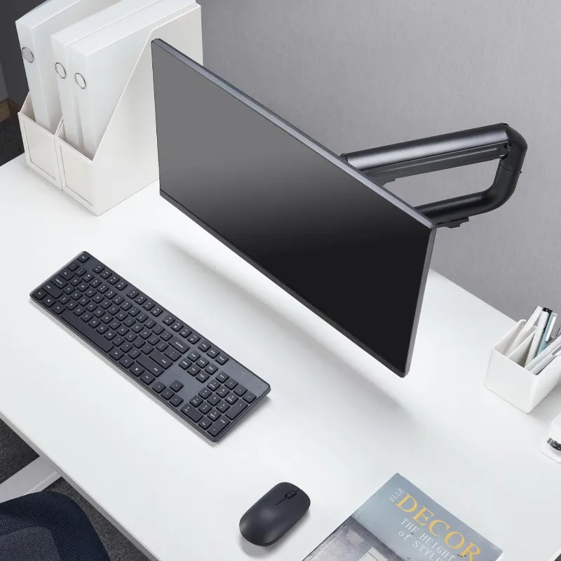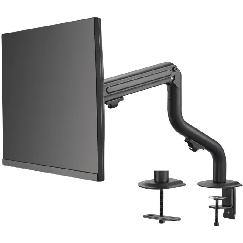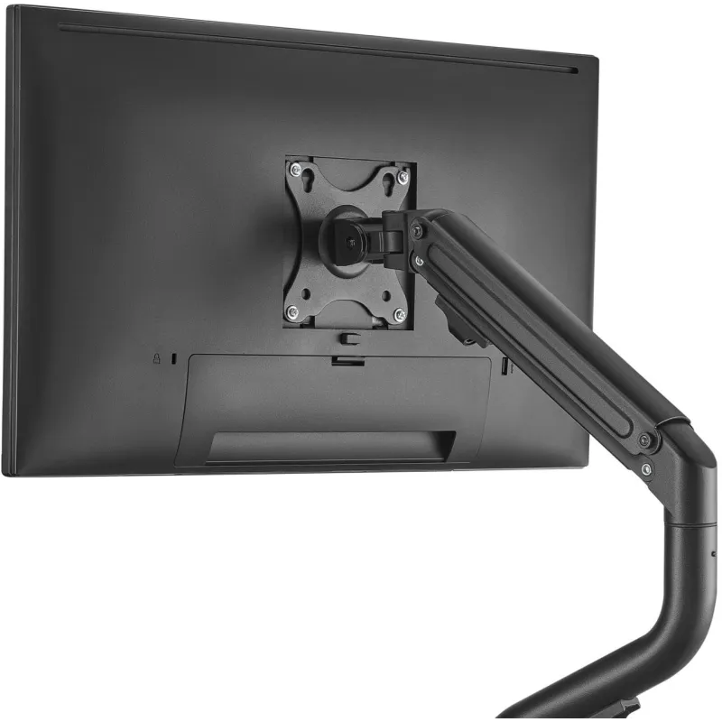 Permite una ajustabilidad completa con un ángulo de inclinación de -45° a 90°, un giro de 360°, y una rotación de 180°, facilitando una visualización óptima en cualquier momento. Además, incluye una eficaz gestión de cables para mantener tu área de trabajo ordenada y libre de enredos. Su robusta construcción en acero y acabado en color negro aseguran durabilidad y un diseño elegante que se integra perfectamente en cualquier entorno.