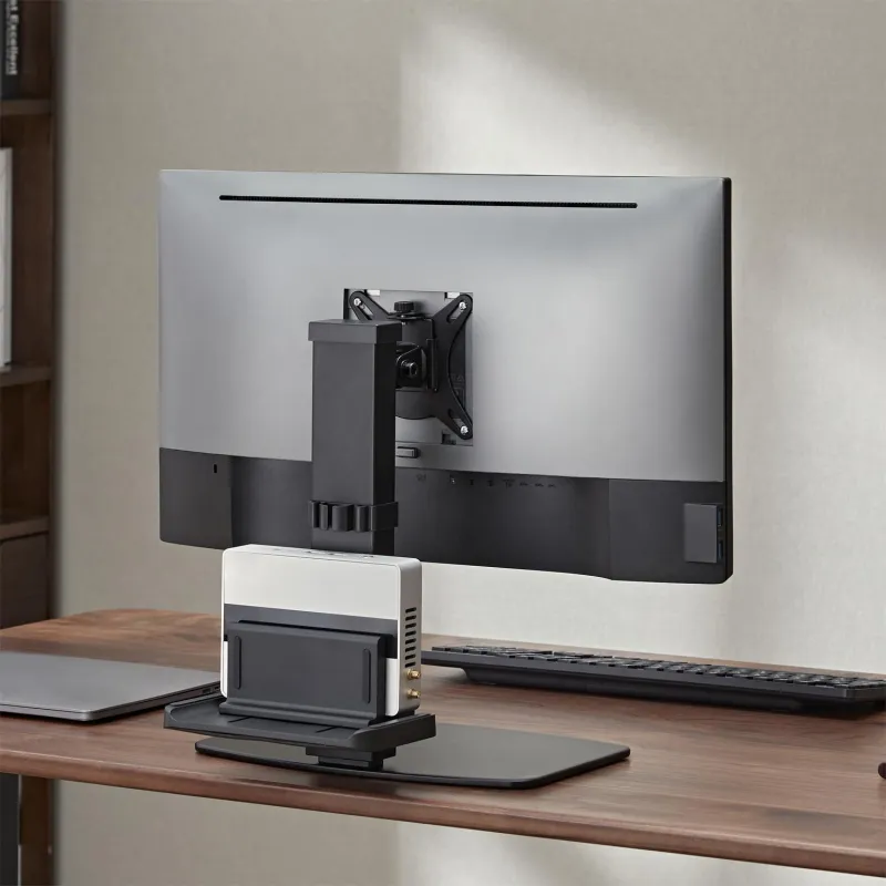 AISENS® – SOPORTE DE MESA ECO GIRATORIO E INCLINABLE PARA MONITOR/TV Y MINI PC DE 17”-32”: Soporte de mesa eco giratorio e inclinable para monitor/TV y mini PC de 17”-32”. Estilo sobremesa, no se necesita anclar el soporte en el tablero de la mesa. Este soporte para monitor cuenta con una característica adicional que lo hace aún más práctico: un soporte para mini PC en su parte posterior. De esta manera, no solo podremos elevar la pantalla a una altura cómoda, sino que también tendremos más espacio libre en nuestra mesa para trabajar de manera más eficiente. ¡Es una forma práctica y ordenada de mejorar nuestro espacio de trabajo!