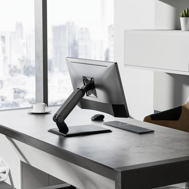 Soporte de mesa profesional contrapeso inclinable para monitor/POS (2 pivotes, 1 brazo) de 17”-32”. Fabricado con acero de alta resistencia y pintado con pintura electrostática para un acabado perfecto. Estilo sobremesa, no se necesita anclar el soporte en el tablero de la mesa. Este Soporte ajustable para pantalla con gran ángulo de inclinación, ideal para pantallas táctiles como terminales POS. Su diseño ergonómico facilita la interacción táctil al permitir ajustes precisos de inclinación, ofreciendo mayor comodidad y estabilidad en cualquier entorno. Destacamos su fácil instalación y ajuste, muy cómodo para el uso diario. VESA Máximo: 100x100mm (Compatible con VESA de 75x75, 100x100mm). Rango de peso de pantalla soportado: 1-8kg. Angulo de Inclinación: -15º / +100º (depende de la instalación y del espacio disponible). Ángulo máximo de rotación: -180º / +180º (depende de la instalación y del espacio disponible). Brazo articulado con muelle para un ajuste fácil y cómodo. Distancia entre mesa y pantalla: ajustable entre 118 y 297mm (depende de la instalación y del espacio disponible).